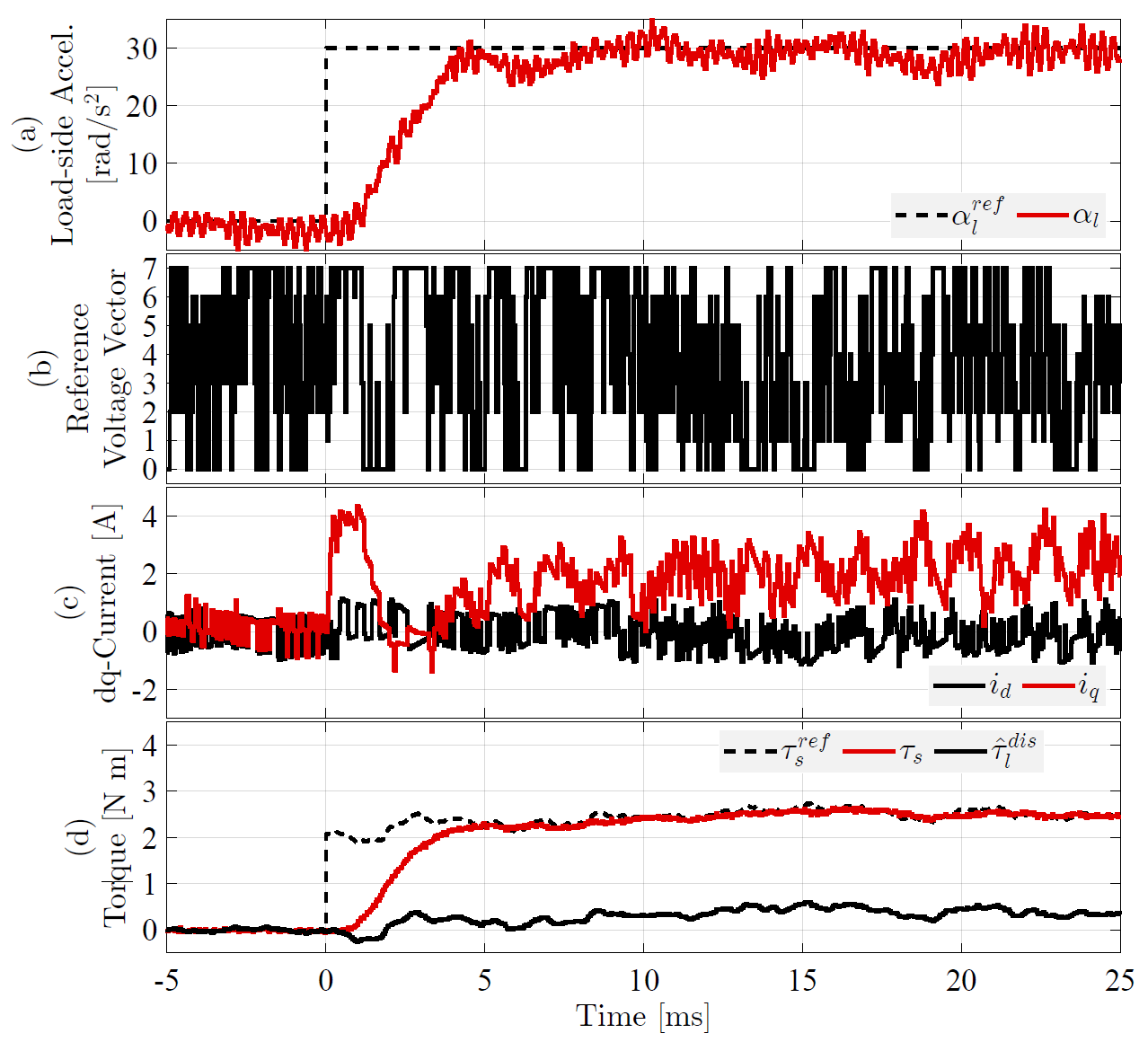 PWMを使わずにインバータの電圧ベクトルを直接操作することによって、 2慣性共振系の負荷側加速度(ロボット先端加速度)を超高速でロバストに制御する手法の研究です。 インバータが出しうる最大の電圧で駆動するので、よくある一般的なハードウェア上において、原理的に人類最速の加速度制御系が組めます。 左図は5ms以内に加速度の整定が可能であることを示した実験結果です。